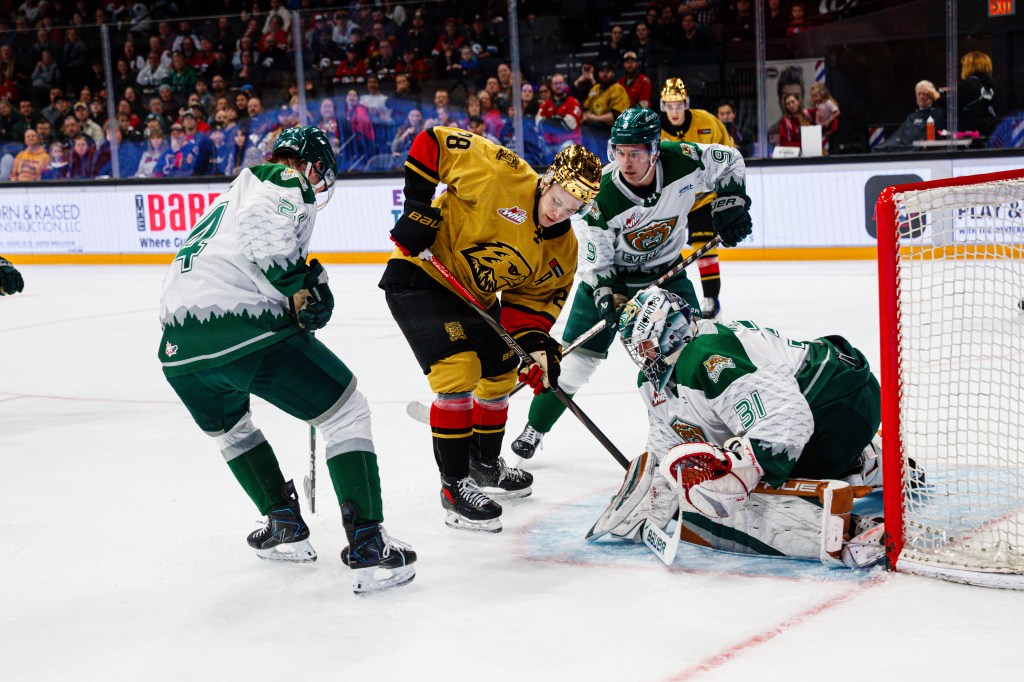 Smith’s goal would hold until late in the third period, when the Silvertips would score again. After Sam Spehar was cut off in the neutral zone, the Silvertips would gain the puck and skate back into the offensive zone. A pass by Carter Bear, would set up Landon DuPont at the top of the faceoff circle. DuPont then fired a shot that would be saved by Cruz Chase, but Chase wouldn’t be able to smother the puck before it was forked free. Matias Vanhanen would poke the puck just beyond the left leg of Chase. From there, Julius Miettinen would be able to jab the puck into the back of the net. Miettinen’s goal would extend the Silvertips lead to 3-1, with 5:24 remaining in regulation.